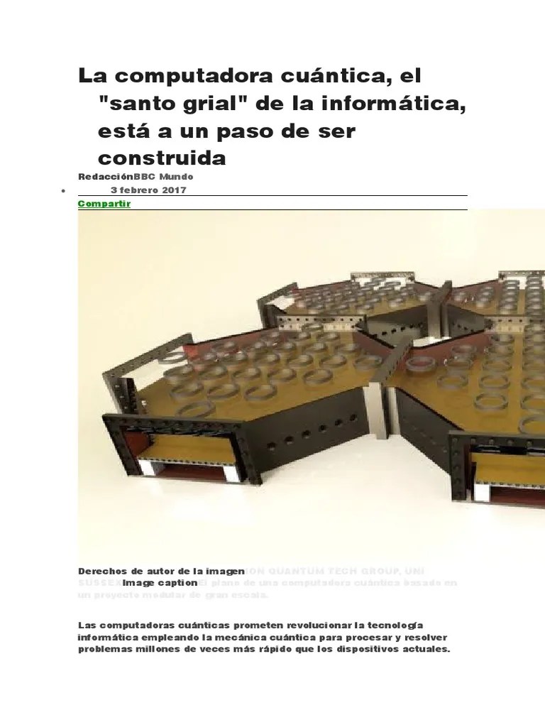 A short summary of this paper. De las computadoras, hace necesario redefinir muchos elementos de la computación actual, la arquitectura, los algoritmos, y los componentes de hardware... Depende de la futura implementación de una computadora cuántica, sin embargo ya se está.